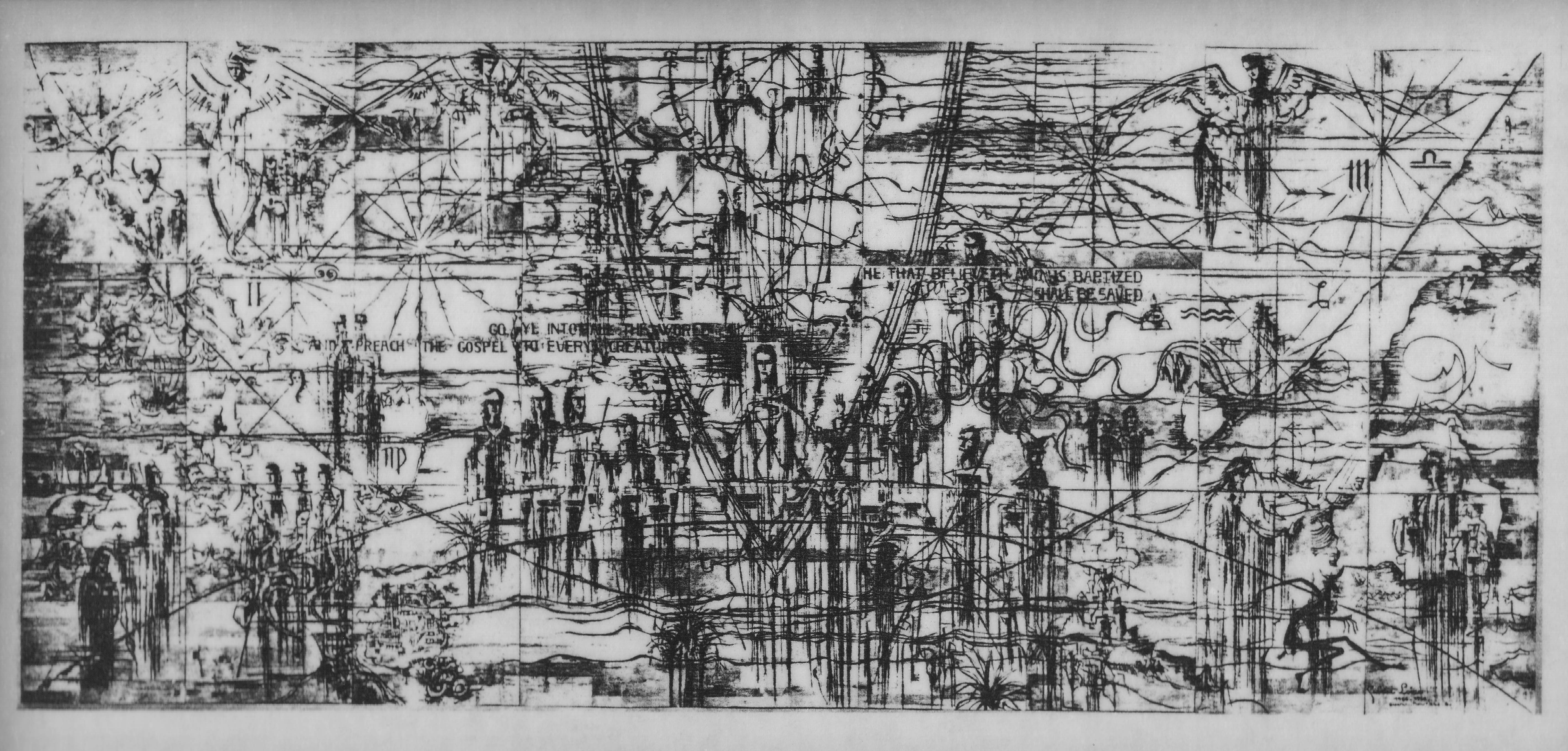 The Church RETURNING TO THE GEOGRAPHICAL REPRESENTATION - ABOVE THE WORDS, "...ALL THE WORLD" THERE IS A SIGN OF THE JERUSALEM CROSS. THIS MARKS THE AREA IN WHICH CHRIST FOUNDED THE CHURCH, IN WHICH HE LIVED HIS LIFE HERE ON EARTH, THE EASTERN PART OF THE MEDITERRANEAN, THE AREA OF THE NEAR EAST. A LITTLE BIT TO THE UPPER LEFT THERE IS A WREATH OF LAUREL WITH THE FIGURES CHI RHO AND THE GREEK LETTERS ALPHA AND OMEGA (FOR SOME REASON THE ARTIST HAS REVERSED THEM AND HAS OMEGA, THEN ALPHA) BUT THAT AREA INDICATES THE CITY OF ROME WHICH IS NOW THE CENTER OF THE CHURCH OF GOD ON EARTH. VISIBLE IS THE EUROPEAN COASTLINE OF THE NORTHERN MEDITERRANEAN JUST JUNDER THE GREEK LETTER OMEGA; ALSO THE IBERIAN PENINSULA AND THE WESTERN COAST OF FRANCE. THE THREE FIGURES, OF COURSE, - ONE AT THE TOP AND THE TWO BELOW REPRESENT THE CHURCH IN THE MINISTRY OF THE PRIESTHOOD.